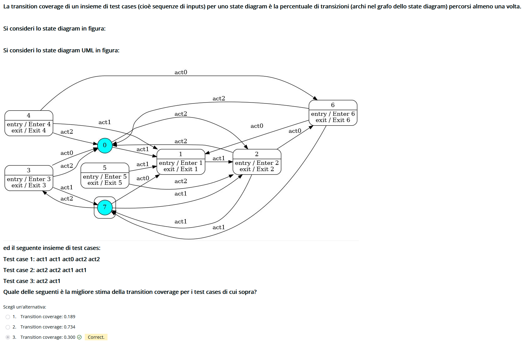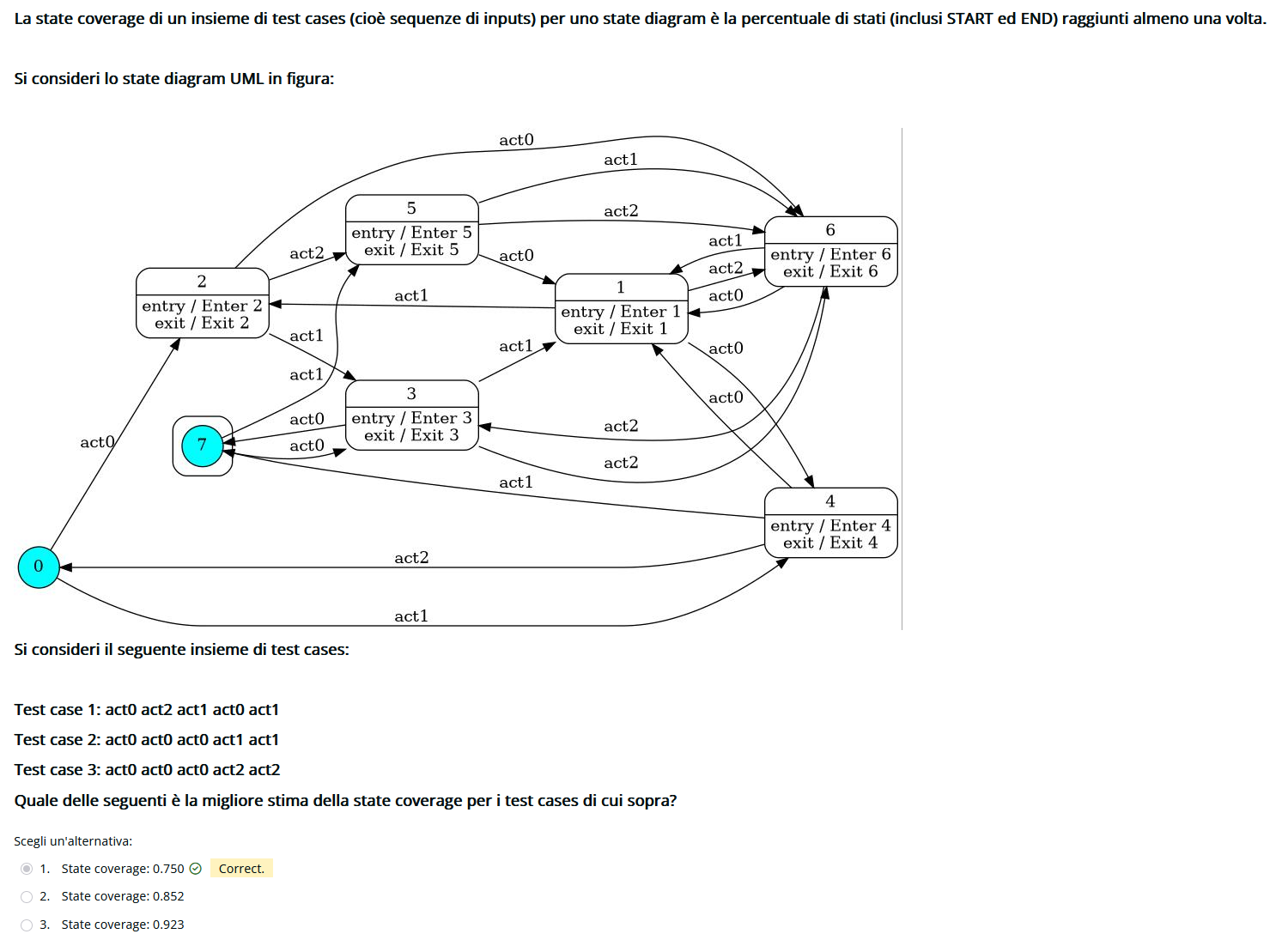 Qui stare attenti se sta chiedendo la coverage degli stati o delle transizioni. In ogni caso per fare prima basta contare il totale e capire fra le soluzioni quale é l’unico numero sensato. Tipo qua sono 20 archi, e l’unico numero possibili é