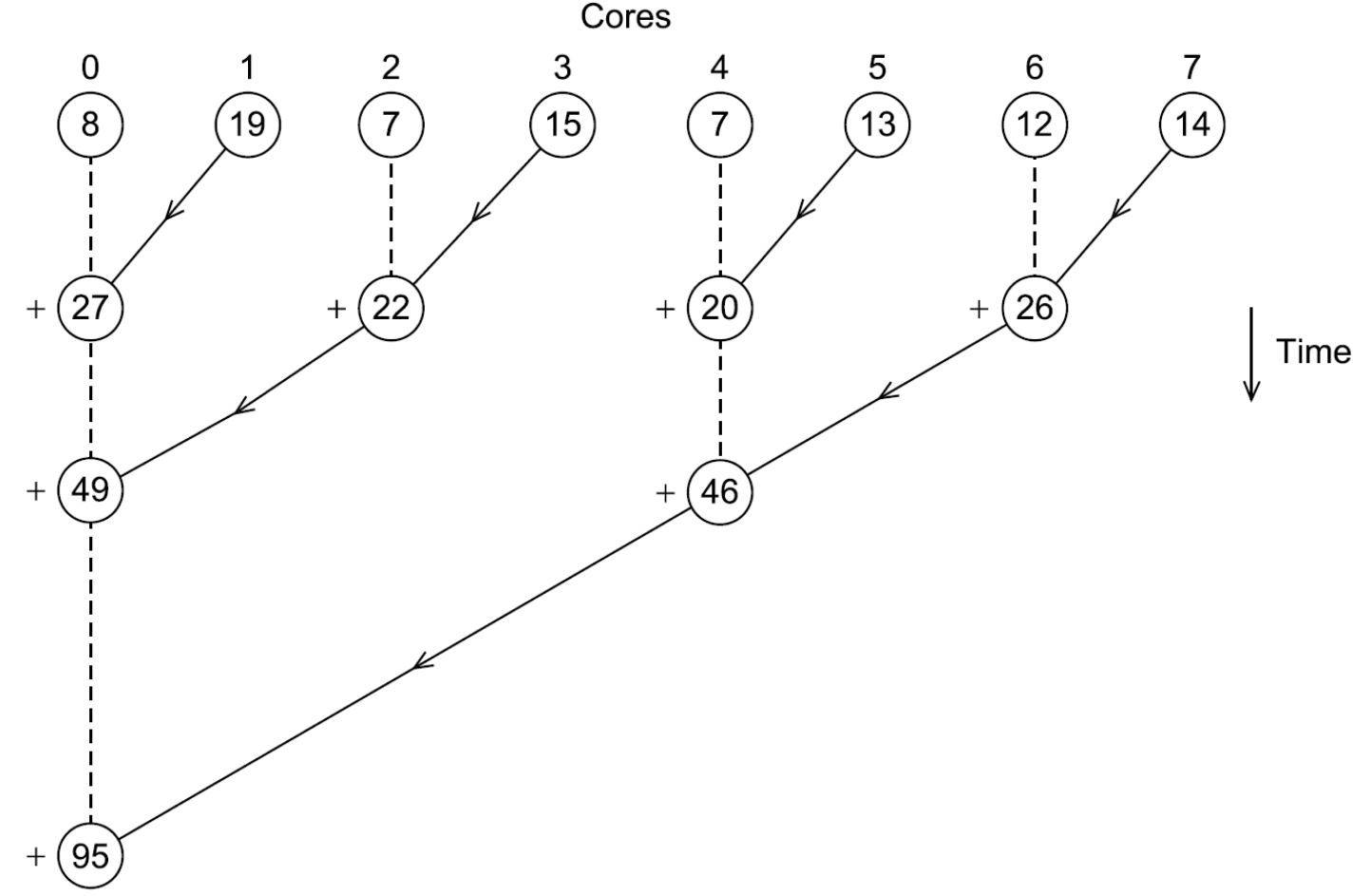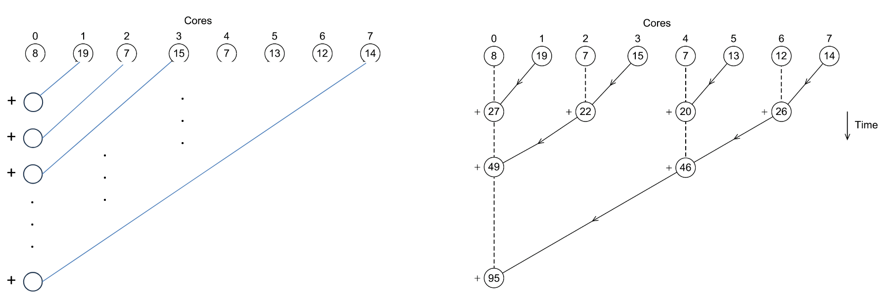 Notiamo che con il primo metodo, quello a sinistra, se abbiamo 8 cores facciamo 7 somme aggiuntive, in generale somme.